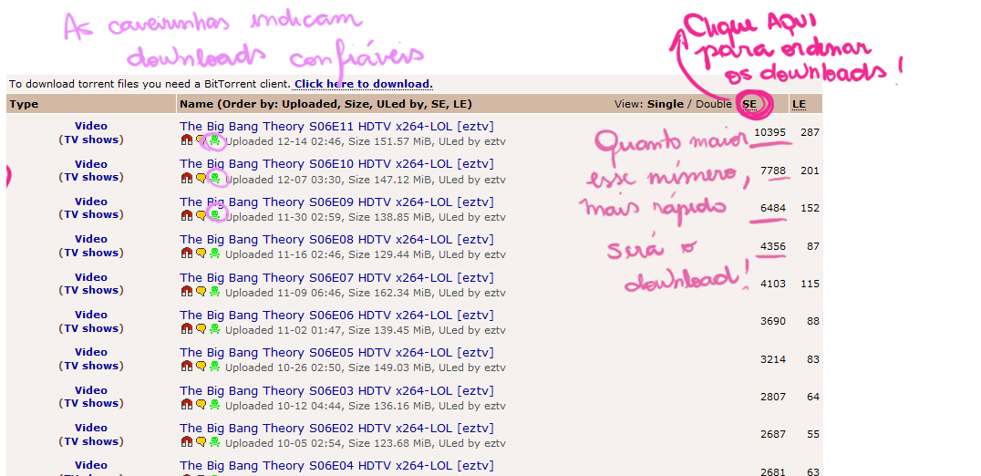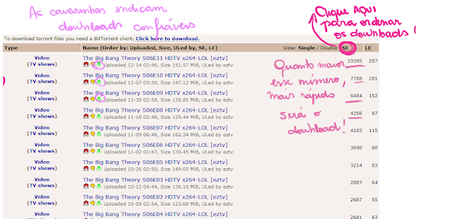 Como eu disse, o download via torrent depende da quantidade de pessoas que já baixou e tem aquele arquivo no computador, já que ele funciona utilizando esses arquivos como suas fontes. Esse número de pessoas que tem o arquivo completo no computador são os "Seeds", e quanto mais, melhor. Ou seja, você olha o número debaixo da coluna "SE" e escolhe o maior que puder pra baixar seu arquivo. Você pode clicar sobre o "SE", para que os links sejam ordenados de acordo com os que possuem maior quantidade de seeds (uns 100-200 seeds já são bons para um download, na minha opinião).