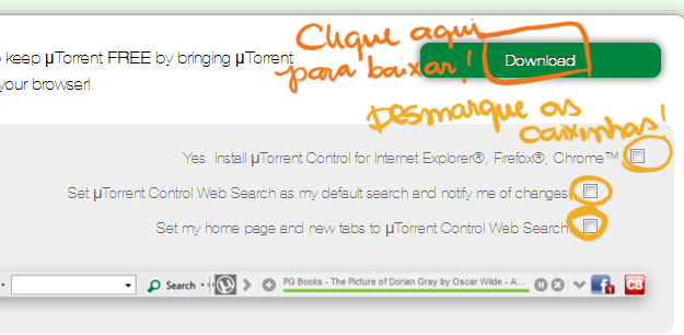 µTorrent (chamado de "uTorrent" ou "miTorrent"), e acho que o resto do mundo também. Mas existem outros, como o BitTorrent, o BitComet, o BitRocket e outros. Caso você não tenha nenhum deles instalado no seu computador, clique aqui pra entrar no site e clique no botão "Get µTorrent". Você vai ser redirecionado pra uma página com a versão free e a versão plus, e claro, baixaremos a gratuita. Passe o mouse sobre o botão verde, "Free Download", pra aparecer uma caixinha.