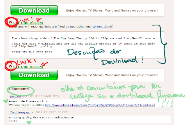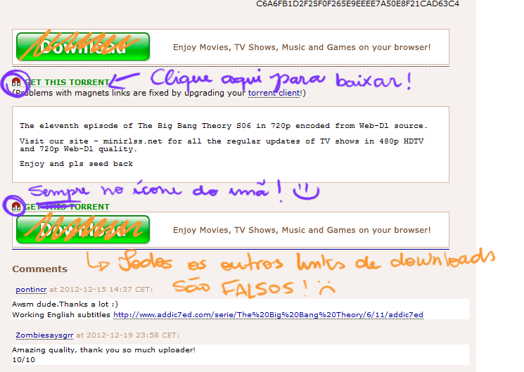 Isso pode dar problemas, assim como nos sites de hospedagem, que costumam ter milhões de botões escrito "Download", um mais chamativo que o outro. No caso do TPB, o link de download é o menor de todos. Aí, clique no iconezinho de imã ou na frase "get this torrent" (ou "Get Magnet Link", já vi aparecer). Nesse caso, desconfie dos botões de download em imagens, e nunca clique neles.