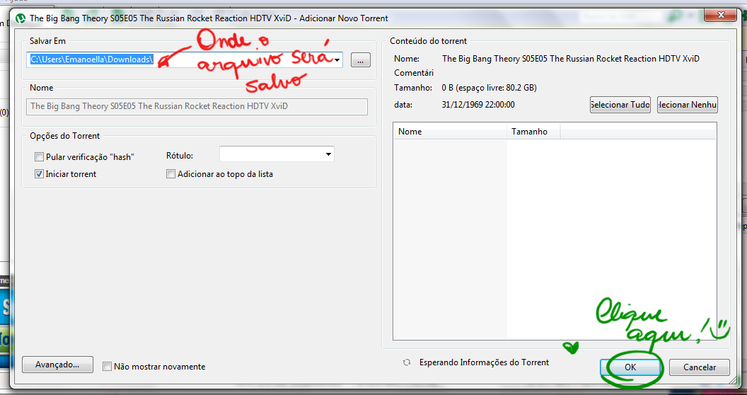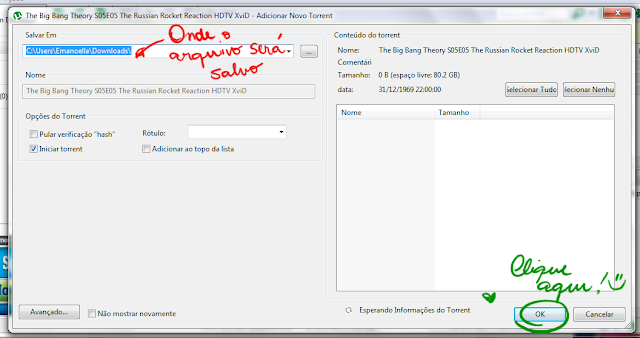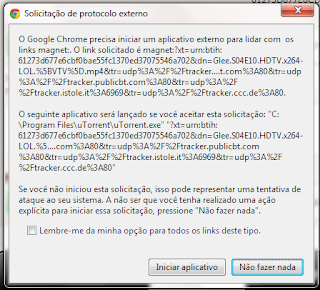Bom, se você clicou no ícone de imã (magnet link), provavelmente uma dessas duas janelas acima abrirá. A primeira abre apenas no Google Chrome, e você pode marcar a caixinha "Lembre-me da minha opção para todos os links desse tipo" e clicar em "Iniciar aplicativo", que a segunda janela vai aparecer. É o cliente torrent, o programa. Ali em cima, você escolhe a pasta em que seu arquivo vai ser salvo e depois clica em ok, pro seu download começar!