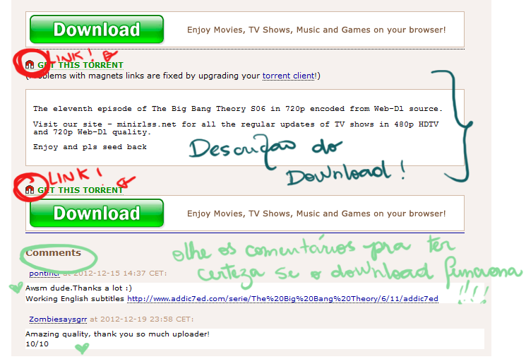 Vamos clicar no link escolhido pra dar uma olhada: Leia a descrição do download, que contém informações sobre o arquivo: no caso dos filmes, muitas vezes está o idioma do áudio e se o torrent tem legendas ou não, além de detalhes sobre a qualidade do arquivo. No caso de programas ou jogos, existem os passos de instalação. Se é isso o que você procura, vamos em frente!